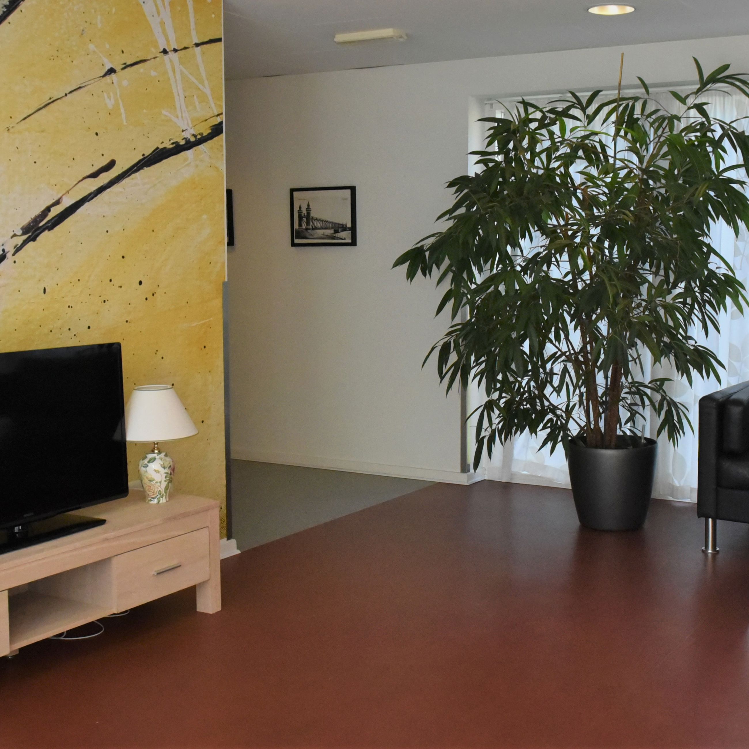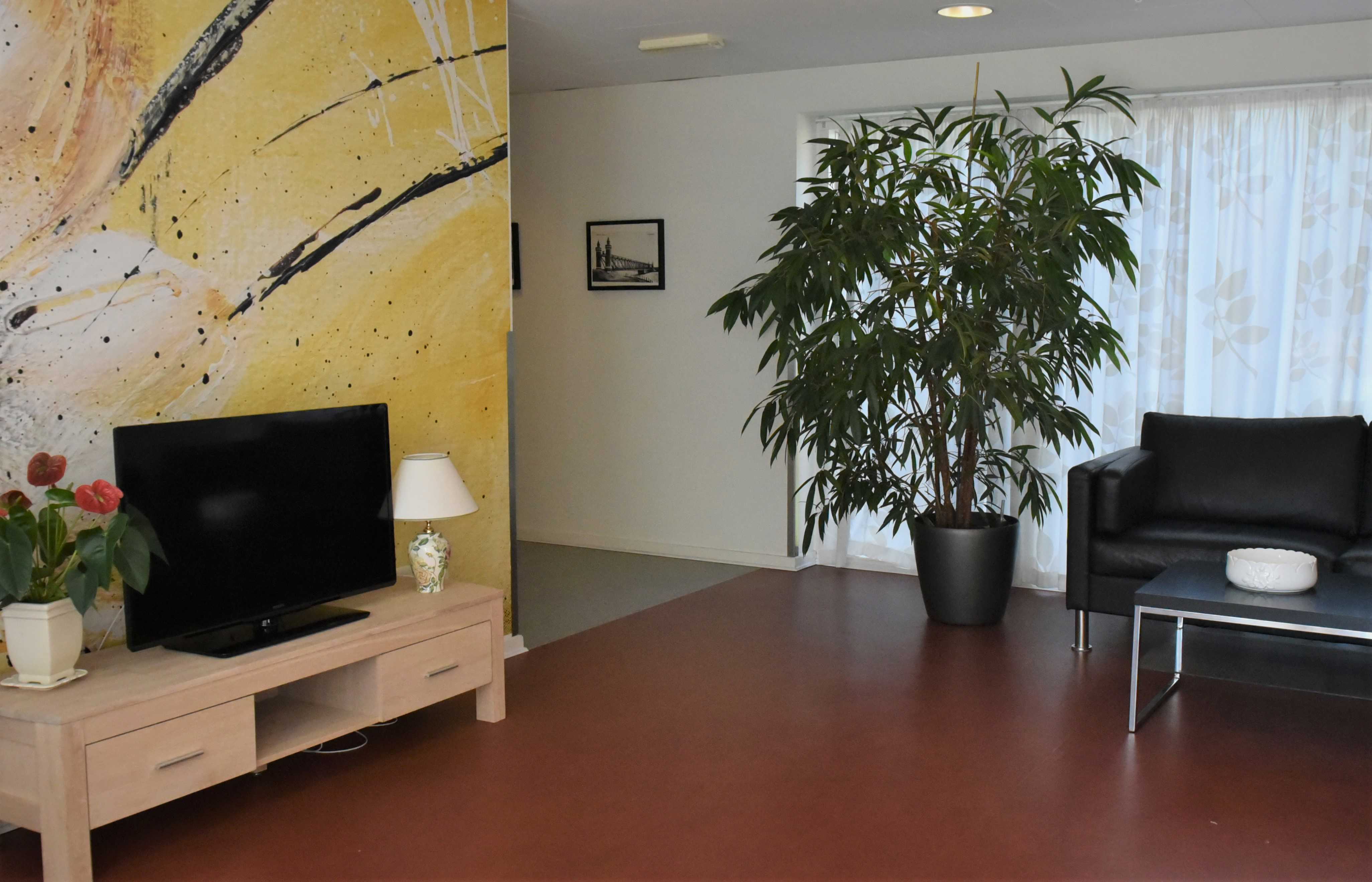 I fællesstuen er der TV, sofahjørne og spisepladser.